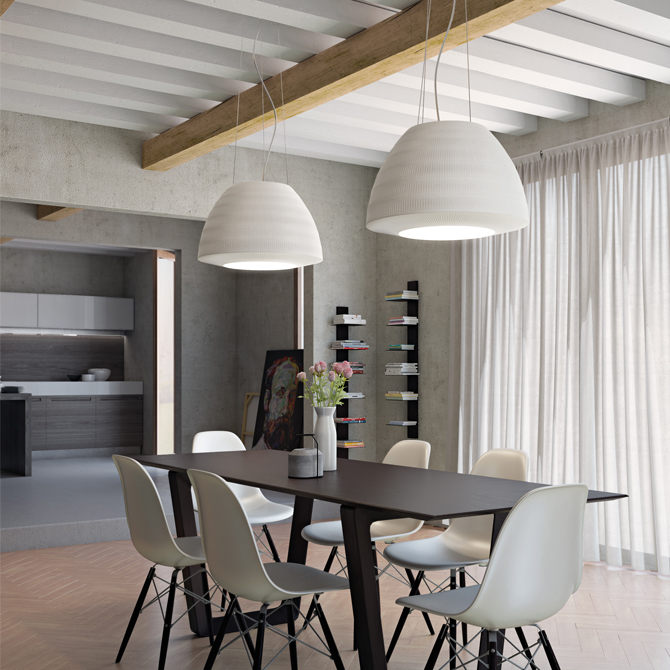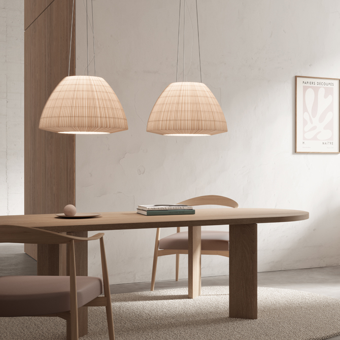 Bell’s soft lines and refined pongé fabric create a timeless design, blending understated elegance with versatility. Even in larger sizes, it remains visually light, enhancing spaces without overwhelming them. Its diffused, enveloping light, along with a range of colors and sizes, allows for full customization. The collection includes suspension, wall, ceiling, and floor lamps, fitting spaces of any scale.