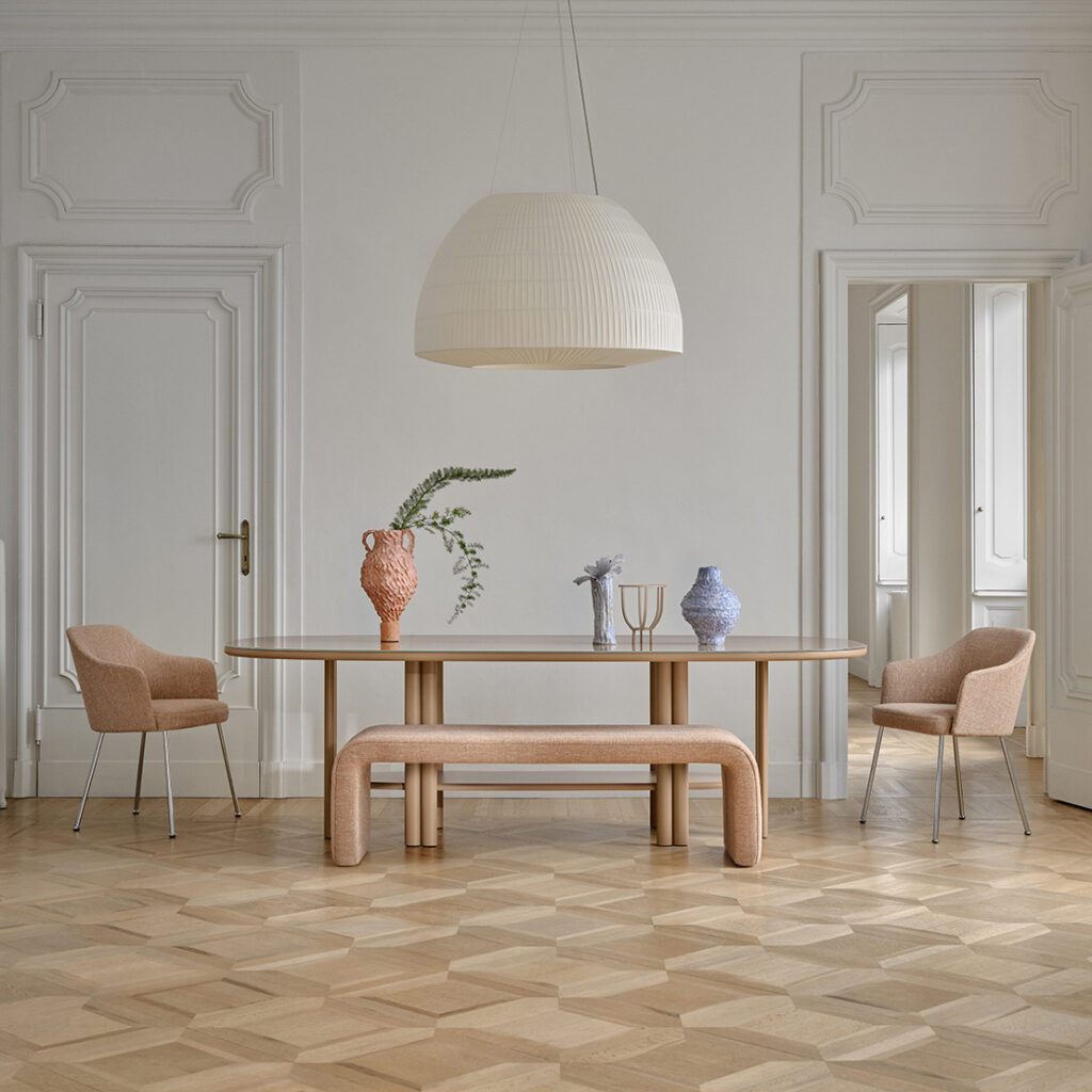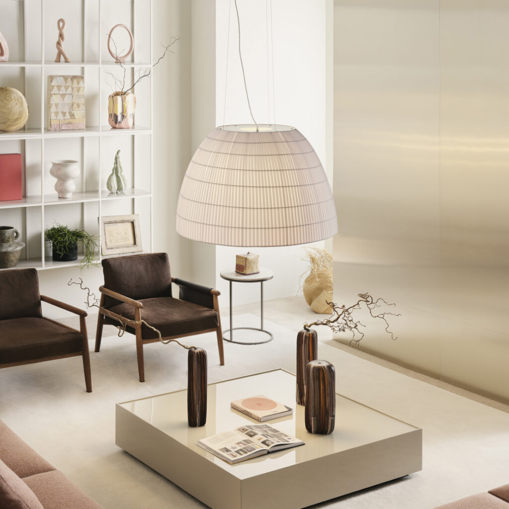 Bell’s soft lines and refined pongé fabric create a timeless design, blending understated elegance with versatility. Even in larger sizes, it remains visually light, enhancing spaces without overwhelming them. Its diffused, enveloping light, along with a range of colors and sizes, allows for full customization. The collection includes suspension, wall, ceiling, and floor lamps, fitting spaces of any scale.