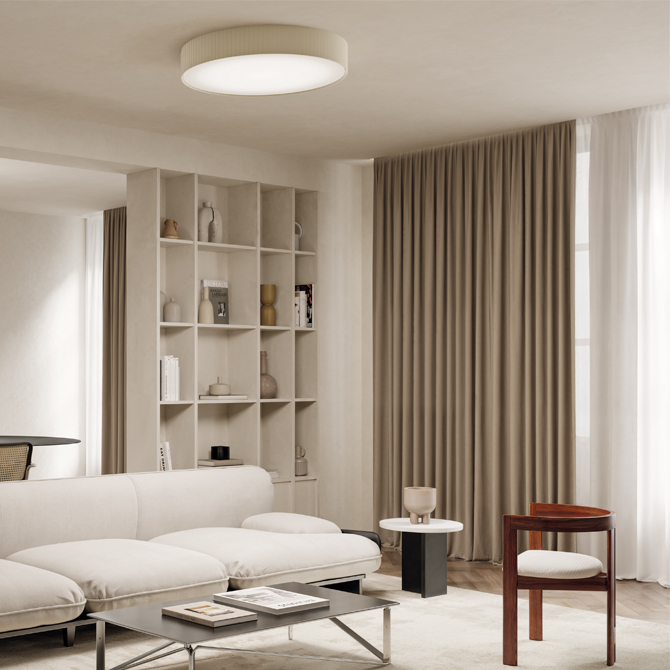 A fabric-wrapped disc blends the elegance of the company’s tradition with the latest lighting technology, giving rise to a collection where form makes way for detail, and light takes center stage.
