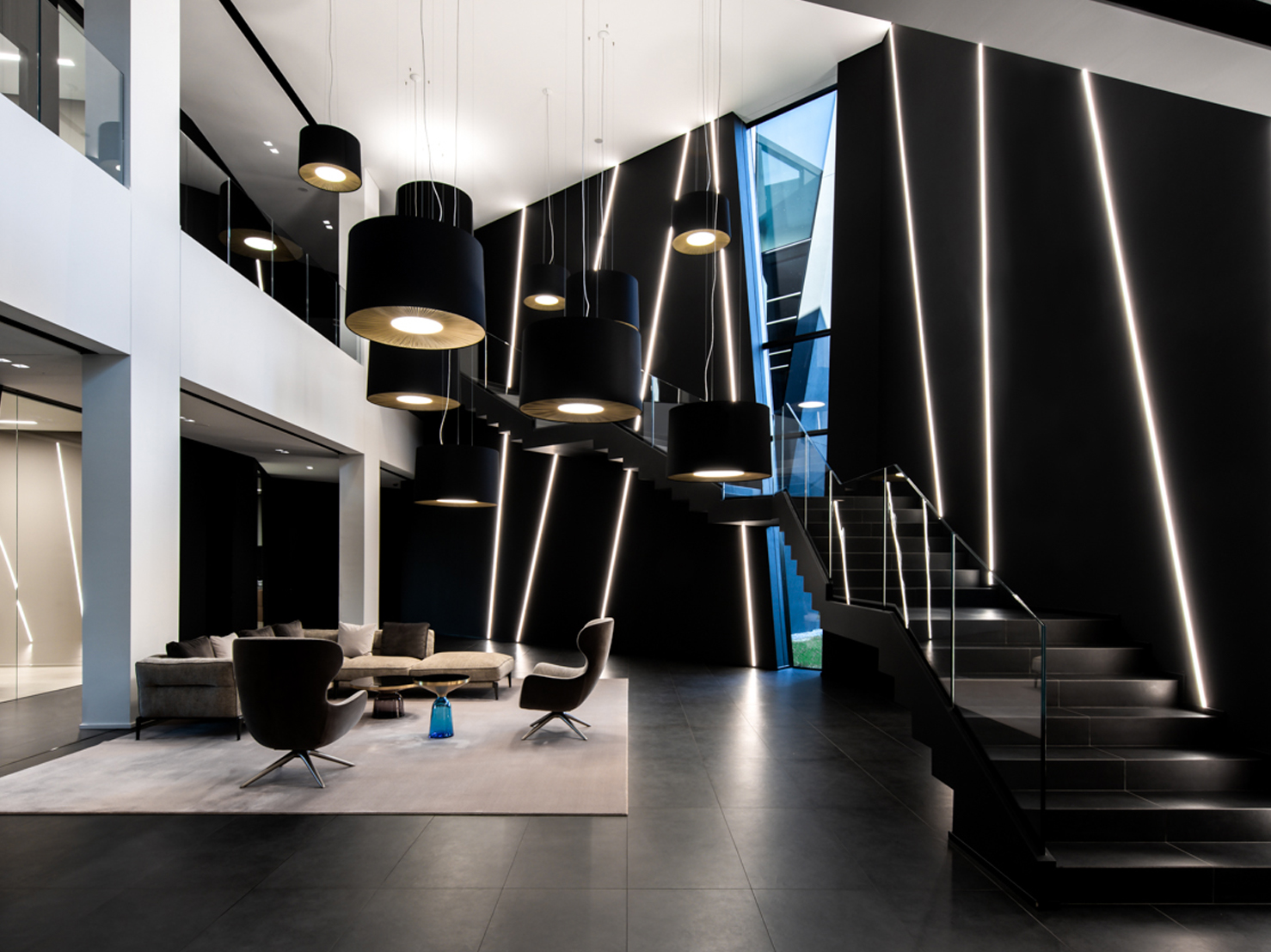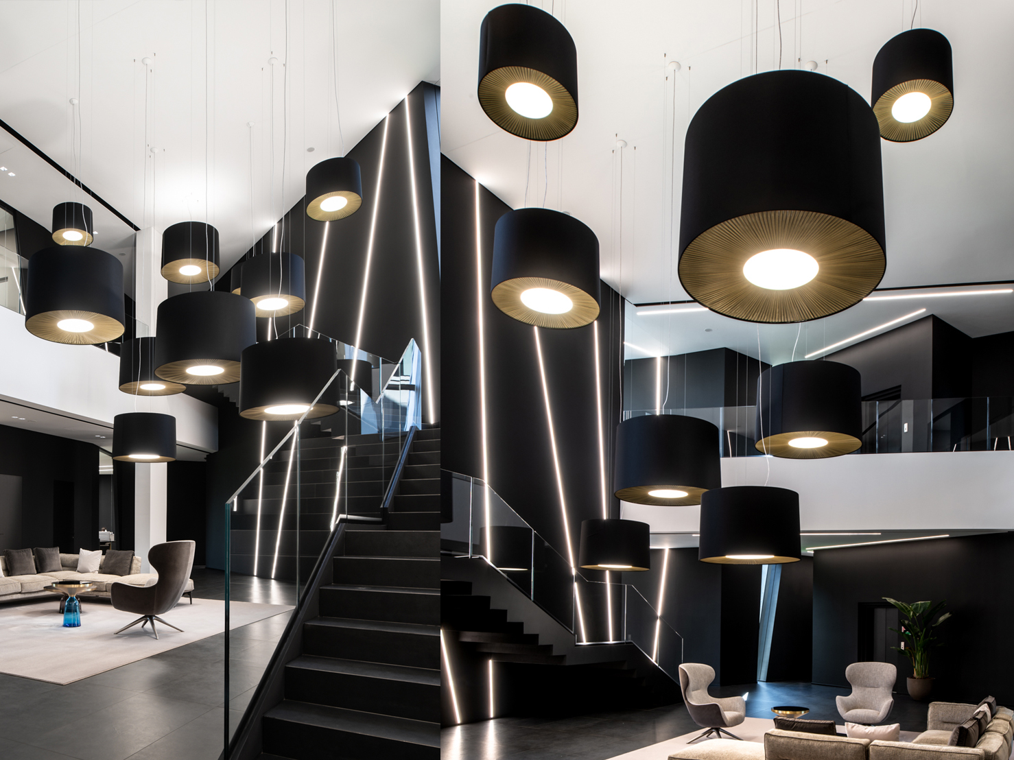Axolight has curated the lighting design of the project, collaborating with the Art director of the client. The final result is a unique lighting installation of ten suspensions Velvet in three different dimensions (diameter 70, 100 and 130 cm). These lamps are covered in a peculiar fabric placed by hand. The inferior part of the lampshade is cover in a double coating, one in pongè fabric in black and one in pleated gold. This monumental artistic installation fills the volumes of the waiting room while making a statement, thanks to the elegant and unique design of these lamps.